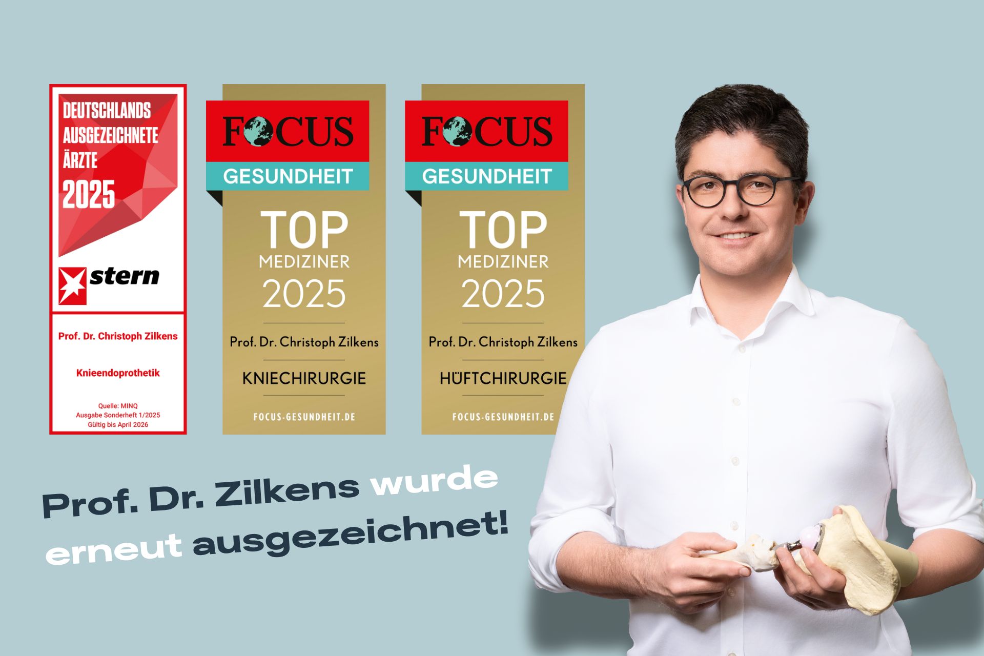 Wir freuen uns sehr: Unser Hüft- und Kniespezialist Prof. Dr. med. Christoph Zilkens wurde erneut von Focus Gesundheit und Stern als Top-Mediziner 2025 in den Bereichen Hüft- und Kniechirurgie ausgezeichnet.